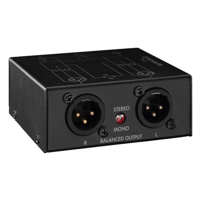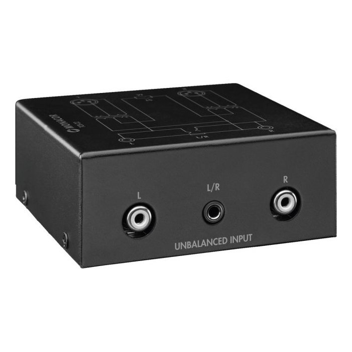 An unbalanced audio signal is passively converted (without power supply) into a balanced signal by means of an audio transformer (doubled in the device).