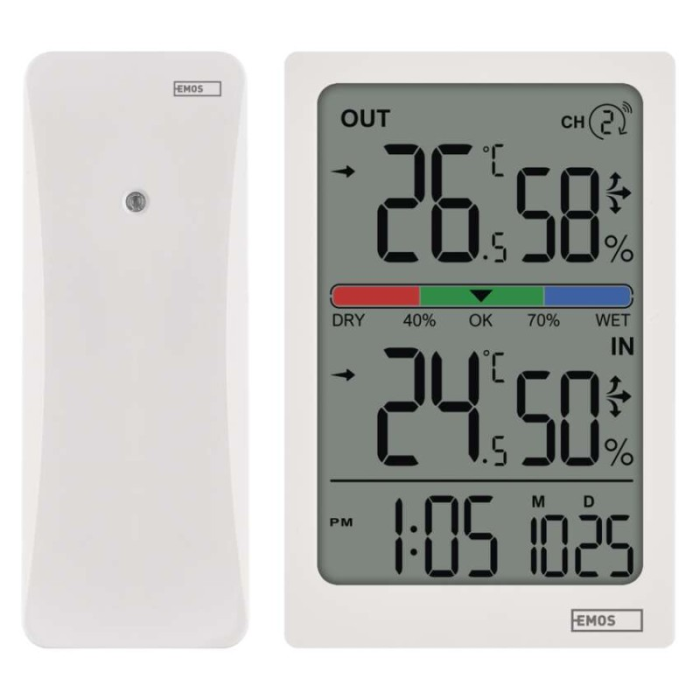 EMOS E0558W sází na maximální čitelnost a účelnost. Displej je rozvržen tak, aby byly všechny podstatné údaje viditelné na první pohled bez nutnosti přepínání tlačítek. Horní polovina patří hodinám a datu, zatímco spodní část je vyhrazena detailním údajům o klimatu. Čistě bílé provedení s tenkým rámečkem působí moderně a nenásilně, takže přístroj snadno splyne s jakýmkoliv interiérem, od minimalistické kanceláře po útulnou ložnici.