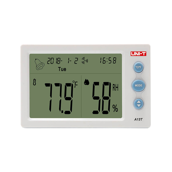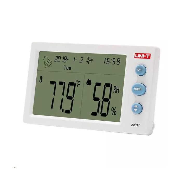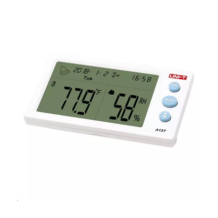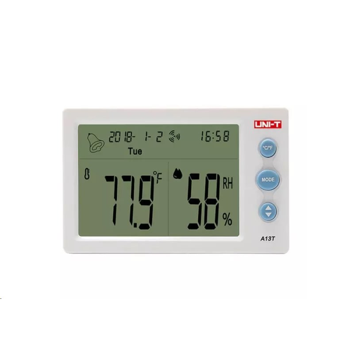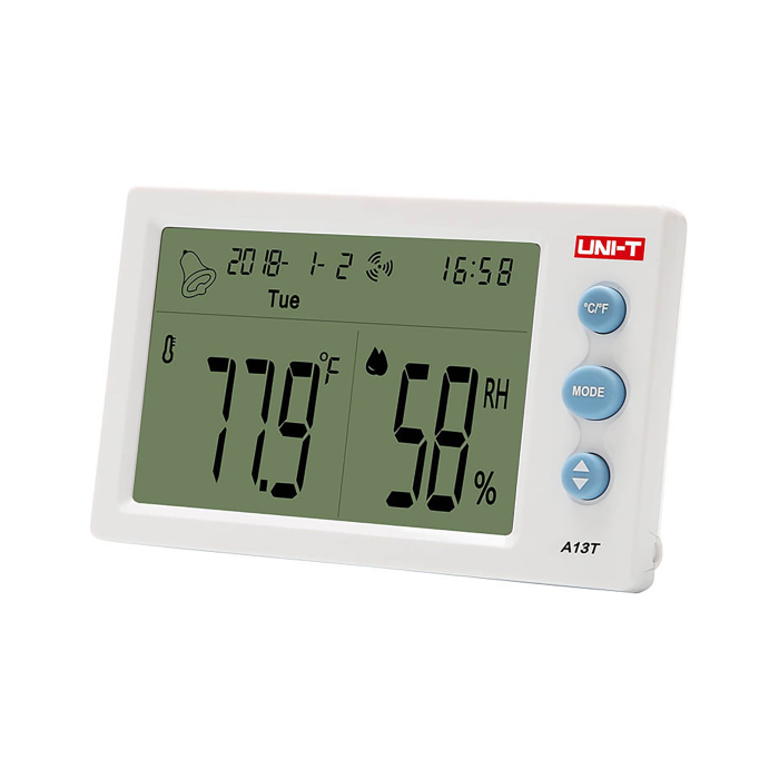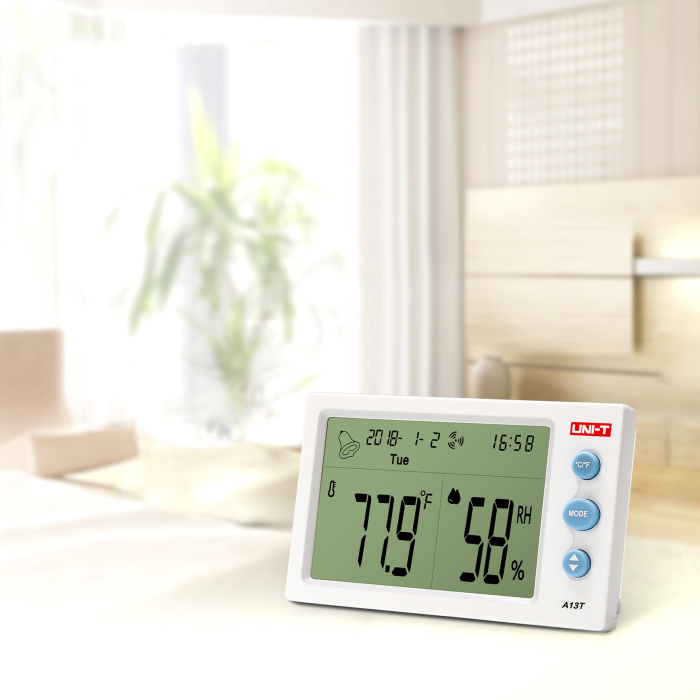 Teploměr a měřič vlhkosti A13T měří teplotu a vlhkost v reálném čase a zobrazuje hodnoty na velké obrazovce.