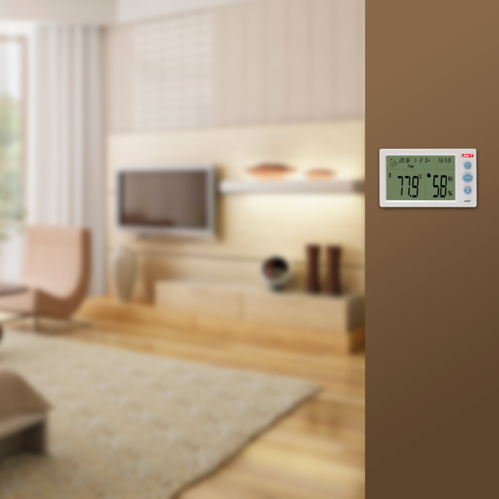 Teploměr a vlhkoměr do interiéru s velkým a přehledným displejem. Rozsah měřených teplot -10°C až 50°C, vlhkosti vzduchu 20% až 95% RH, budík a časový režim 12/24 hodin