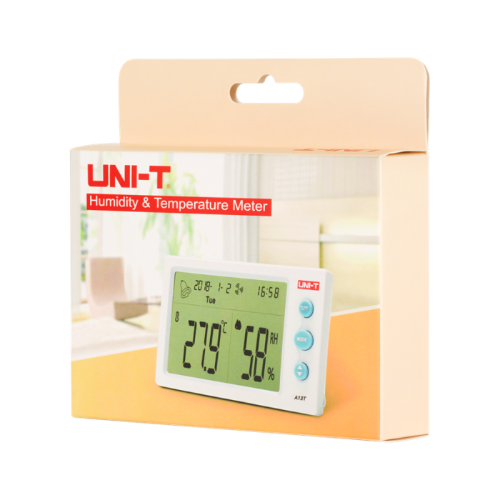 Teploměr A13T lze použít pro vnitřní měření, pomocí závěsného otvoru zavěsit na zeď, nebo s přiloženým stojánkem postavit na stůl.
