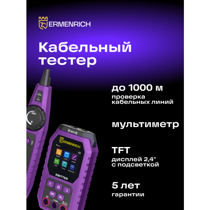 Tester kabelů s multimetrem Ermenrich Ping SM75 je multifunkční přístroj pro komplexní diagnostiku a zjišťování stavu telefonních linek, počítačových sítí a elektrických zařízení. Tento přístroj je určen pro profesionály, kteří se zabývají instalací a údržbou sítí v průmyslovém, kancelářském i rezidenčním prostředí.