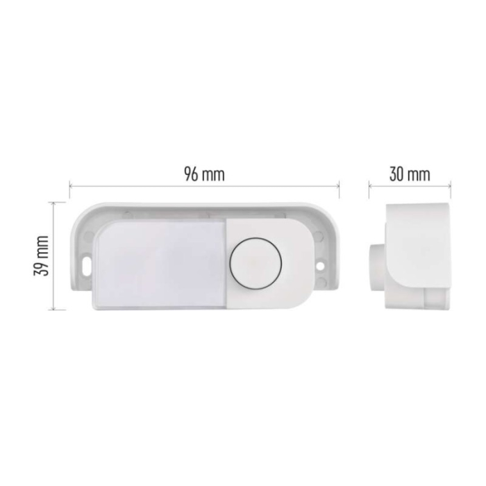 Tlačítko EMOS P57000T pro drátové zvonky P57101 a P57102 s krytím IP44. Rozměry 96 × 30 × 39 mm, drátové připojení, napájení 8, 12, 24 V AC/DC.