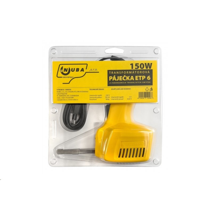 Klasická transformátorová páječka české výroby, napájení 230V, příkon 150W, osvětlení LED diodou, uchycení pájecího očka upínačem.