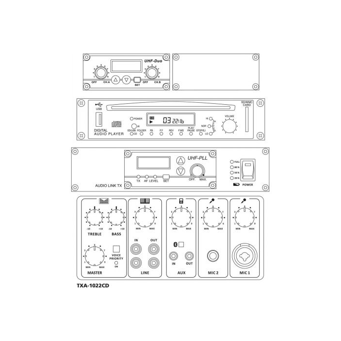 Integrovaný bezdrôtový vysielač TXA-1022CD prenáša zvukové signály do jedného alebo viacerých systémov TXA-1020. Ideálny pre väčšie indoorové PA aplikácie, pri ktorých sa vyžaduje konzistentné zvukové žiarenie.