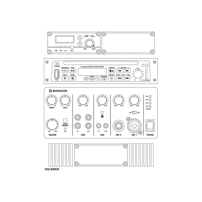 s integrovaným 1-kanálovým multifrekvenčným prijímačom s technológiou UHF PLL a Bluetooth prijímačom.