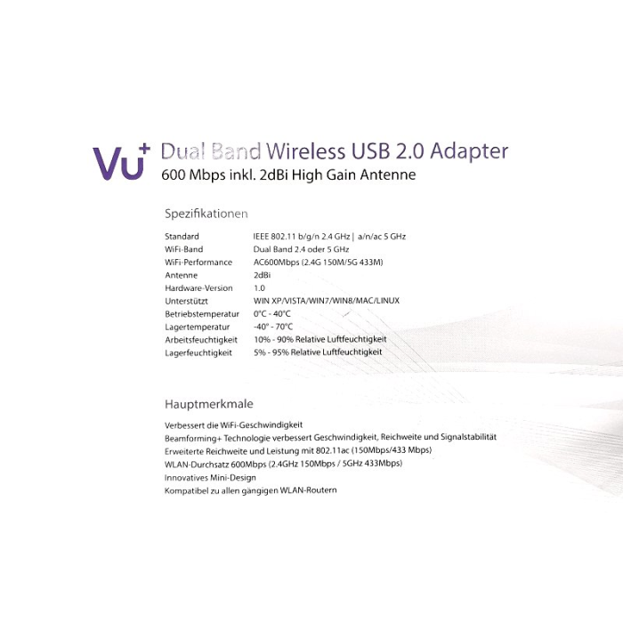 USB Wi-Fi duální adaptér 2,4 / 5 GHz se ziskem 2 dBi umožňující připojení do bezdrátové sítě Wi-Fi. Podporuje rychlost bezdrátového přenosu až 600 Mbps. Je určen primárně pro použití k satelitním přijímačům VU+, ale dá se použít také k notebookům i klasickým počítačovým sestavám.