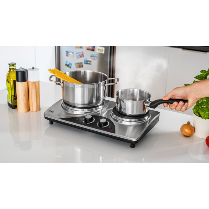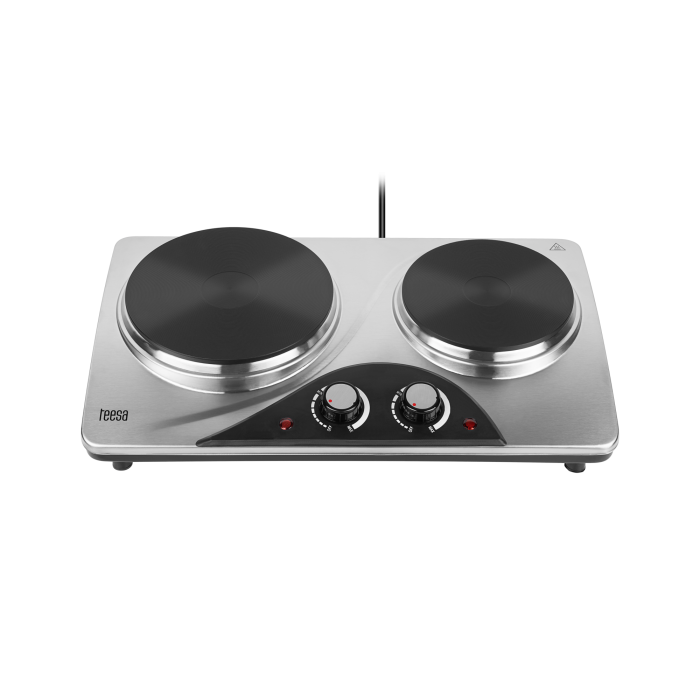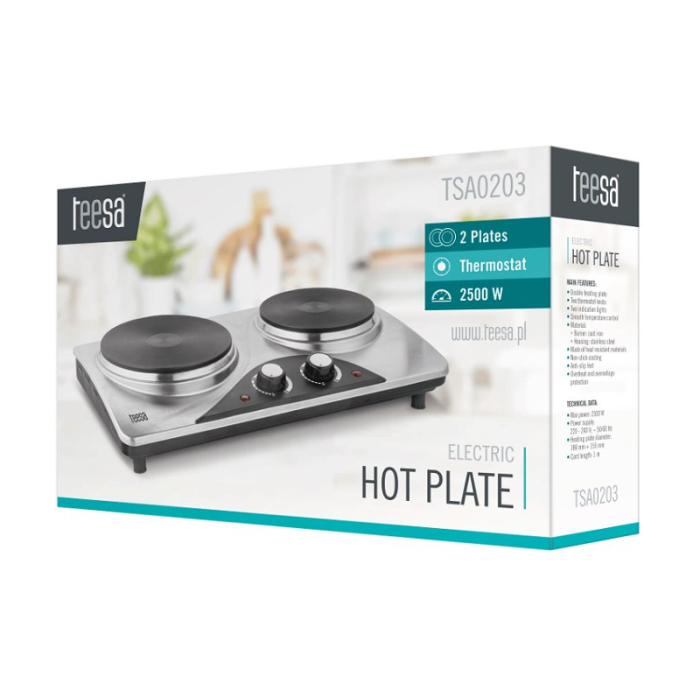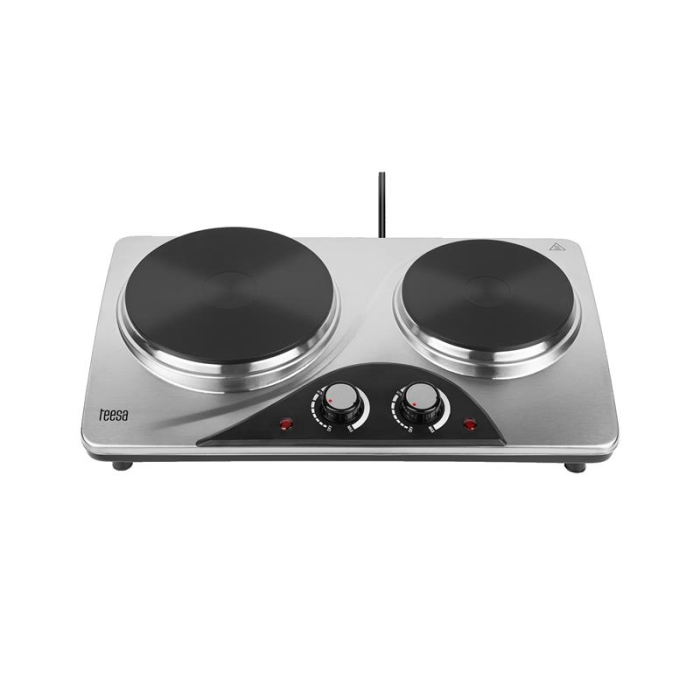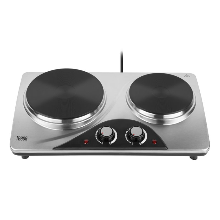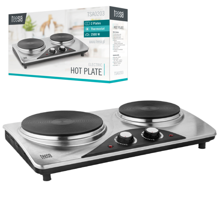 TEESA TSA0203 je nerezový dvouplotýnkový elektrický vařič s příkonem 2500W. Ochrana proti přehřátí a přepětí, odolné materiály.