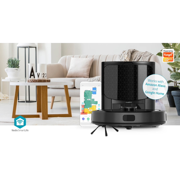 Vysavač můžete ovládat mobilní aplikací Nedis SmartLife nebo pohodlně hlasem přes Google Assistant a Amazon Alexa. Plánujte úklid, vytvářejte zóny nebo spusťte úklid jedním kliknutím – i když nejste doma.