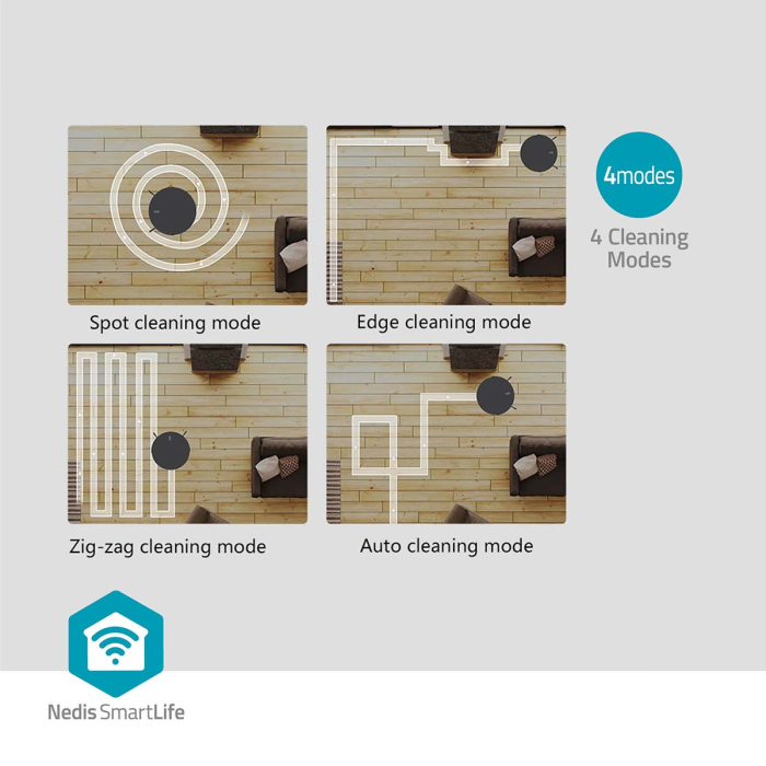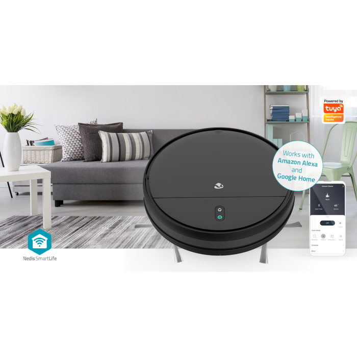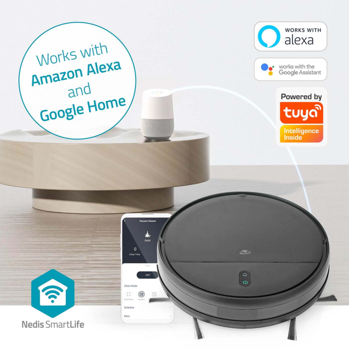 Díky Wi-Fi konektivitě a integraci do aplikace Nedis SmartLife můžete vysavač ovládat odkudkoli – přes telefon nebo hlasem díky kompatibilitě s Google Assistant a Amazon Alexa. Vysavač můžete spustit, i když nejste doma, nastavit plán úklidu, nebo jej poslat na konkrétní místo. Součástí balení je i dálkový ovladač pro snadné řízení bez telefonu.