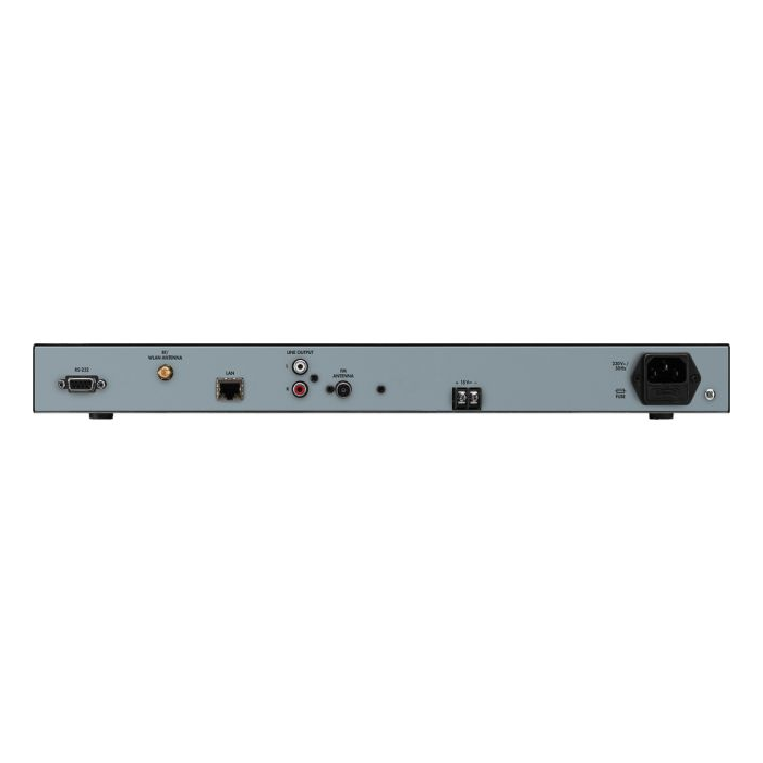 Connections: 1 x 3.5 mm stereo jack (aux in), 1 x RCA L/R (line out), 1 x 3.5 mm stereo jack (headphones), 1 x RJ45 (LAN) 1 x WLAN/Bluetooth antena 1 x RS-232 interface